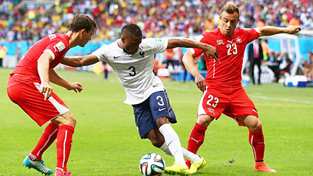 Patrick Evra (giữa) trước sự truy cản của các cầu thủ Thụy Sĩ. Ảnh: FIFA.