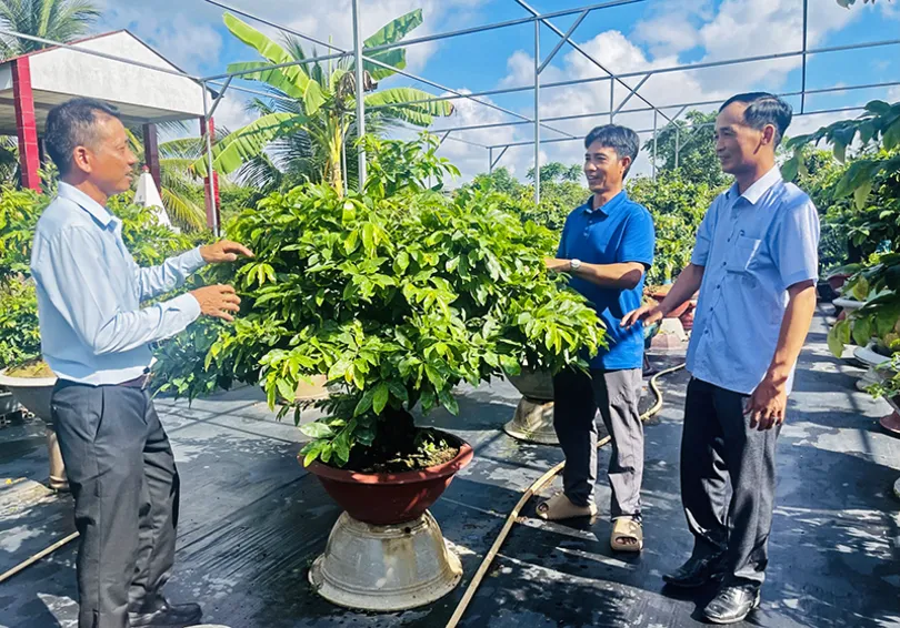 Cán bộ Mặt trận và tổ chức chính trị - xã hội phường Hưng Phú tìm hiểu tình hình sản xuất, đời sống của các thành viên Câu lạc bộ Khoa học - kỹ thuật Mai vàng.
