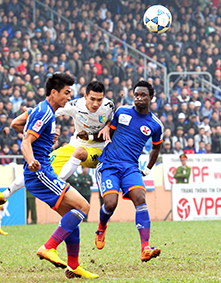 Cầu thủ Hà Nội T&T (giữa) gặp HAGL mùa giải 2014. Mùa bóng này HAGL sẽ hoàn toàn khác với lực lượng U19 của Học viện Bóng đá HAGL Arsenal JMG.
