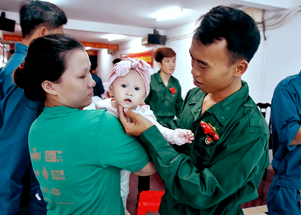 Thanh niên Quách Trọng Vinh (ở khu vực 5, phường Cái Khế, quận Ninh Kiều) chia tay vợ con trước khi cùng các thanh niên trong phường tập trung lên quận. Ảnh: X.Đào