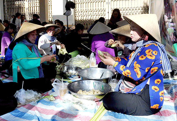 Hội thi gói bánh lá dừa, bánh ít tại Hội trại tòng quân quận Ô Môn. Ảnh: ANH DŨNG