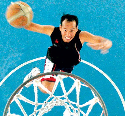 Tiếp Ri Đa Ni thực hiện động tác úp rổ trong một buổi tập.