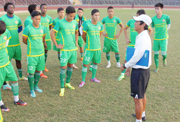 HLV Vũ Quang Bảo yêu cầu các học trò thi đấu nhiệt tình trước trận đấu tập huấn với Cà Mau. |