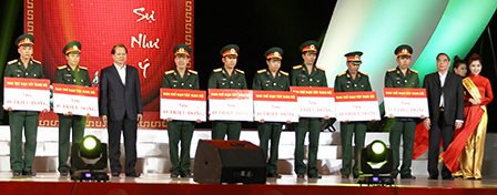Đồng chí Lê Hồng Anh- Thường trực Ban Bí thư Trung ương Đảng và đồng chí Vũ Văn Ninh, Phó Thủ tướng, Trưởng Ban Chỉ đạo Tây Nam Bộ, trao tượng trưng nhà nghĩa tình đồng đội cho các chiến sĩ công tác nơi biên giới, hải đảo.