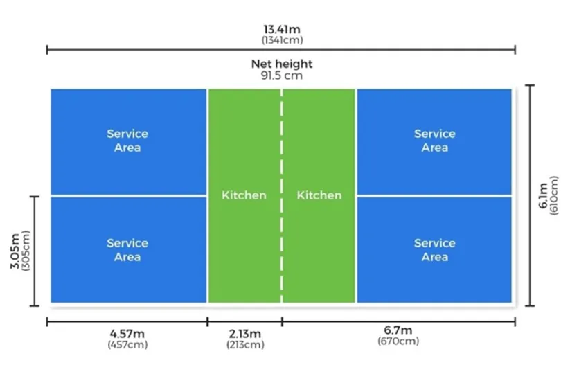 Theo quy định của USA Pickleball, sân Pickleball có kích thước thống nhất cho cả đánh đơn và đánh đôi. Đây là tiêu chuẩn USA mặt sân Pickleball giúp tối ưu diện tích và dễ triển khai thi công.