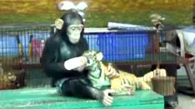 Một con tinh tinh tại sở thú Samut Prakarn (Thái Lan) đã khiến khách tham quan vừa ngạc nhiên vừa thích thú khi chứng kiến cảnh nó cầm bình sữa cho cọp con bú hằng ngày.