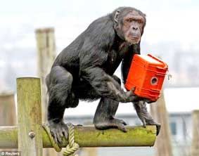 Đài truyền hình BBC tối 27-1 trình chiếu bộ phim tài liệu đầu tiên được thực hiện bởi những con khỉ. Đó là thành quả suốt 18 tháng trời của 11 con tinh tinh trong Sở thú Edinburgh (Scotland). Cầm máy quay trên tay (ảnh), bọn chúng đã thay phiên “ghi hình lẫn nhau”. Camera được đặt vào hộp cứng và có màn hình ở bên hông để con vật có thể nhìn thấy những gì chúng đang quay. Do được thực hiện bởi những tay máy a-ma-tơ nên hình ảnh trong phim “Not-so-steady cam!” đều rung rinh.