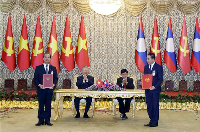 Kết thúc hội đàm, Tổng Bí thư Tô Lâm và Tổng Bí thư, Chủ tịch nước Lào Thongloun Sisoulith đã chứng kiến lễ trao các văn kiện hợp tác quan trọng giữa các bộ, ngành, địa phương và các cơ quan hữu quan của hai nước trên các lĩnh vực giáo dục, tư pháp và hợp tác giữa các địa phương; tiếp tục tạo nền tảng pháp lý và động lực mới, cụ thể hóa nội hàm gắn kết chiến lược trong quan hệ hợp tác giữa hai nước.