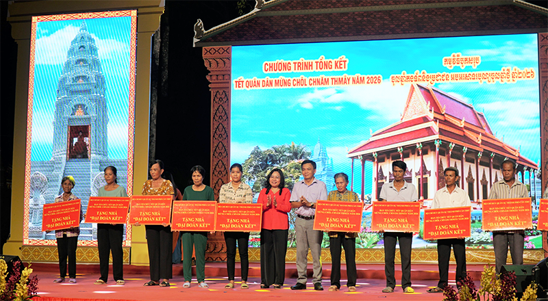 Ban Tổ chức Tết Quân Dân mừng Chôl Chnăm Thmây năm 2026 trao bảng tượng trưng nhà Đại đoàn kết tặng các gia đình gặp khó khăn về nhà ở. Ảnh: PHẠM TRUNG