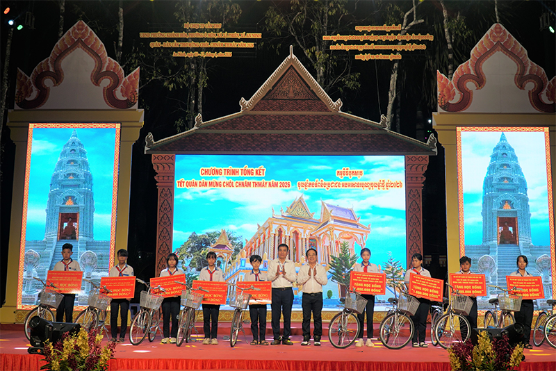 Ban Tổ chức Tết Quân Dân mừng Chôl Chnăm Thmây năm 2026 trao học bổng và xe đạp tặng các học sinh vượt khó học giỏi. Ảnh: PHẠM TRUNG