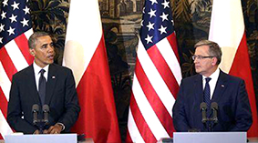 Tổng thống Ba Lan Bronislaw Komorowski (phải) và ông Obama trong cuộc họp báo ngày 3-6. Ảnh: Reuters