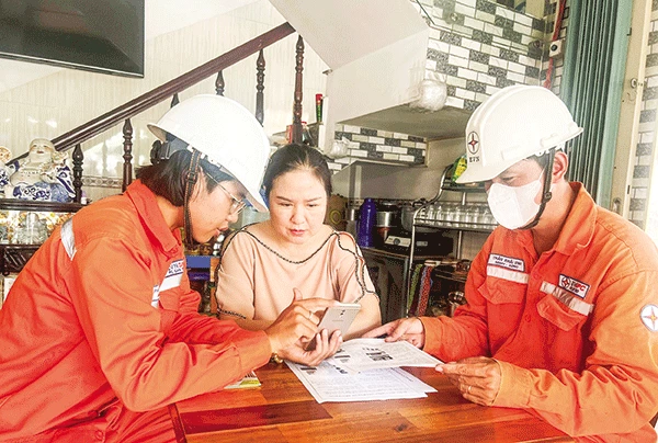 Cán bộ, công nhân Điện lực Bình Thủy hướng dẫn hộ kinh doanh ở phường Trà Nóc cài đặt App chăm sóc khách hàng CSKH EVNSPC để nắm bắt các dịch vụ về điện...