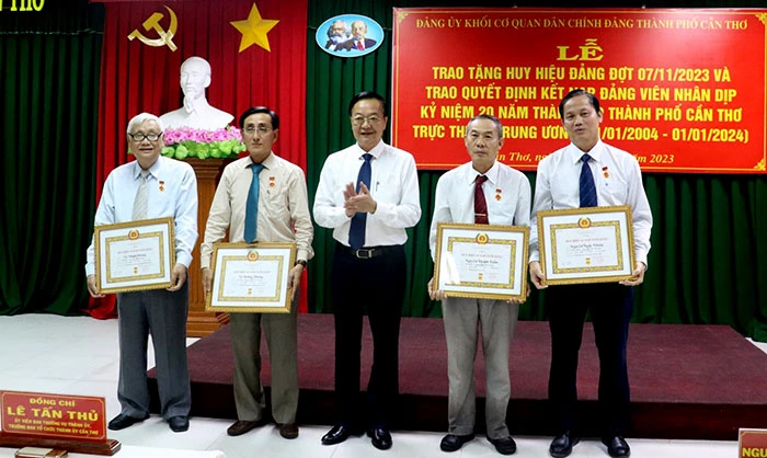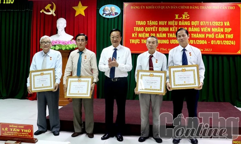 Tại buổi lễ, Đảng ủy Khối đã công bố Quyết định số 1250-QĐ/TU của Ban Thường vụ Thành ủy Cần Thơ tặng Huy hiệu Đảng đợt 7-11-2023 cho đảng viên. Trong đó, Đảng bộ Khối có 2 đảng viên nhận Huy hiệu 40 năm tuổi Đảng, gồm: đồng chí Lê Hoàng Thông, Phó Bí thư Đảng ủy, Phó Chánh Thanh tra TP Cần Thơ và đồng chí Lê Thanh Phong, Phó Chủ tịch Thường trực Hiệp hội Du lịch ĐBSCL; 2 đảng viên nhận Huy hiệu 30 năm tuổi Đảng, gồm: đồng chí Nguyễn Thanh Tuấn, Phó Tổng Biên tập Báo Cần Thơ và đồng chí Nguyễn Ngọc Thung, Đảng ủy viên, Trưởng Phòng Nghiệp vụ, Cục Hải quan TP Cần Thơ.