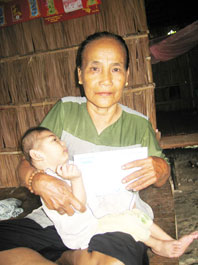Bà Nguyễn Thị A và bà Lê Thị Khéo (ẵm cháu nội Nguyễn Văn Tính) nhận tiền bạn đọc gửi tặng.
