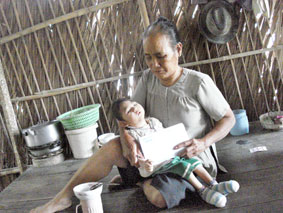 Bà Lê Thị Khéo (bà nội cháu Tính) nhận tiền bạn đọc gởi tặng. Ảnh: X.ĐÀO