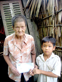 Bà Lê Thị Rẫy và người cháu nhận tiền bạn đọc gởi tặng. Bà Rẫy gởi lời cảm ơn đến các nhà hảo tâm.
