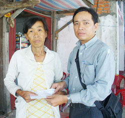 (CT)- Trước sự chứng kiến của chính quyền địa phương, phóng viên Báo Cần Thơ (ảnh) vừa trao 1,684 triệu đồng từ tiền đóng góp của bạn đọc gửi cho bà Bùi Thị Lượm (ngụ ấp Tân Hiệp Lợi A, xã Tân Đức, huyện Đầm Dơi, tỉnh Cà Mau). Đây là lần thứ 3 Báo Cần Thơ trao tiền của bạn đọc gửi giúp đỡ gia đình bà Lượm sau khi đọc bài “Bà lão ăn mày và gia đình người điên”. Trong đó các bạn đọc gồm bà Hồ Phương (Việt kiều Canada), Nguyễn Văn Hoàn (Việt kiều Mỹ), Nguyễn Thị Bạch Tuyết (Cần Thơ) đã nhờ Báo Cần Thơ chuyển tiền giúp gia đình Bà Lượm vượt qua khó khăn.
