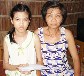 Kiều Yến và mẹ xúc động khi nhận tiền của bạn đọc gởi tặng. |