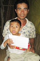 Cháu Nguyễn Danh Phúc và cha cháu đang nhận tiền bạn đọc gởi tặng. |