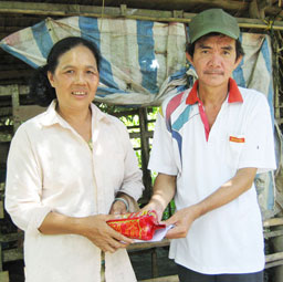Bà Huỳnh Thị Kết (cô Huỳnh Thị Cẩm Tú) nhận tiền bạn đọc gởi tặng trước sự có mặt của đại diện chính quyền địa phương. |