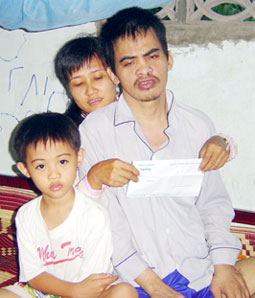 Vợ chồng anh Triệu Ngân Giang vui mừng nhận tiền của bạn đọc Báo Cần Thơ gởi tặng.