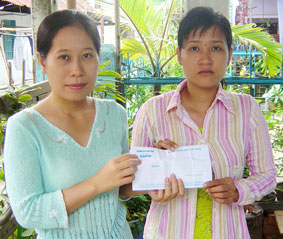 Vợ anh Triệu Ngân Giang (bên phải) vui mừng nhận tiền của bạn đọc Báo Cần Thơ gởi tặng. |