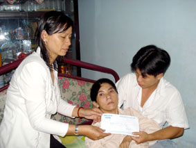 Đại diện Báo Cần Thơ trao tiền của bạn đọc gởi ủng hộ cho chị Đỗ Thị Ngọc Liễu. |