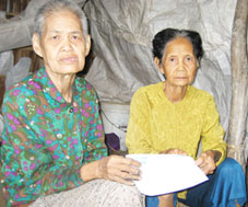 Bà Nguyễn Thị Tám (bên trái) cùng chị bà xúc động khi nhận tiền bạn đọc gởi tặng. |