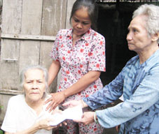 Cô Ba Chi Lan, cán bộ hưu trí của phường An Hòa, trao tiền của bạn đọc Báo Cần Thơ gởi giúp bà Năm Kuôl. |