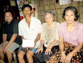 Anh Lê Văn Trí (từ trái qua, người thứ 2) rất cảm động khi nhận được tiền bạn đọc gởi giúp cho gia đình anh. |