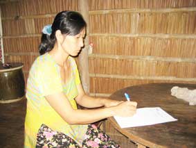 Chị Nguyễn Thị Thắm (mẹ của cháu Nguyễn Phú Đông) đang ký nhận tiền bạn đọc.