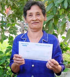 Bà Lang nhận tiền từ thiện của bạn đọc Thái Việt Hoa gởi tặng. Ảnh: H.V. |