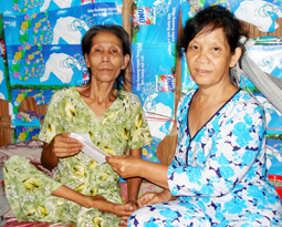 Bà Hoa (bên trái) nhận tiền bạn đọc trao tặng.