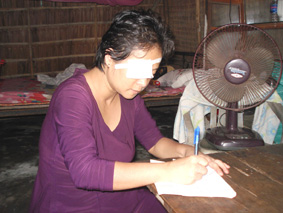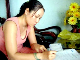 Bà Ngọc ký nhận tiền bạn đọc trao tặng. |