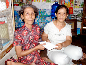 Bà Hoa (bên trái) nhận tiền bạn đọc trao tặng. |