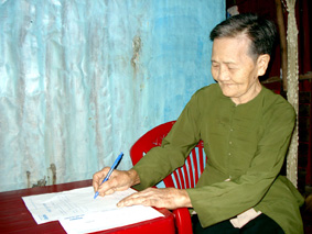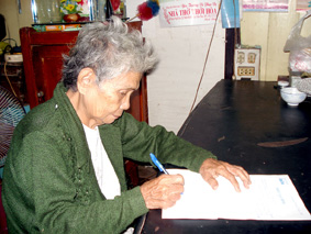 Bà Sạch ký nhận tiền bạn đọc trao tặng. |