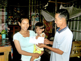 Ông Lâm Khem, đại diện địa phương trao số tiền bạn đọc giúp đỡ cho chị Phol (mẹ bé Như). |