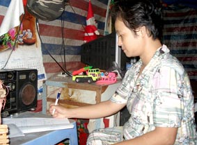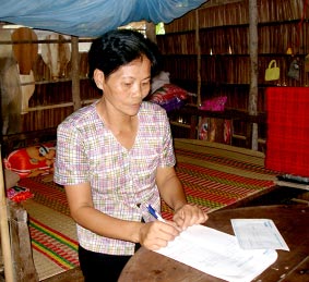 Mẹ bé Minh Duy ký nhận tiền bạn đọc gởi tặng. |