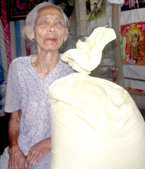 Vợ ông Nguyễn Văn Được nhận quà do nhà hảo tâm gởi tặng. Ảnh: V.T |