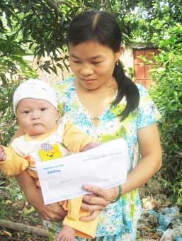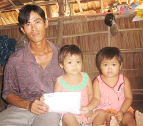 Gia đình hai bé song sinh Mộng Thúy và Mộng Kiều nhận tiền bạn đọc gửi tặng.