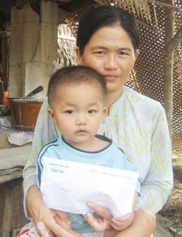 Gia đình bé Thái Công Hiếu nhận tiền bạn đọc gửi tặng. Ảnh: T.HẰNG.