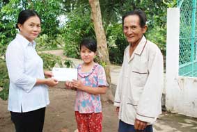 Bà Nguyễn Thị Lệ Thủy, Phó Chủ tịch Hội CTĐ quận Cái Răng trao tiền của bạn đọc Báo Cần Thơ gởi ủng hộ cháu Bùi Thị Thắm.