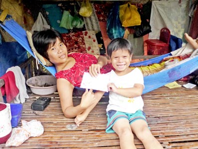 Chị Lê Thị Nhìn cùng con gái vui mừng nhận tiền bạn đọc gửi tặng.