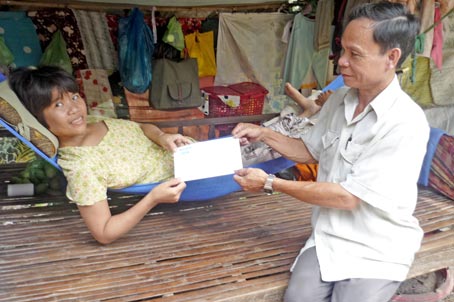 Đại diện Ban Công tác Mặt trận ấp Mỹ Nhơn trao tiền của bạn đọc Báo Cần Thơ gởi tặng chị Lê Thị Nhìn.