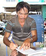Cha của bé Mơ ký nhận số tiền bạn đọc gởi tặng.