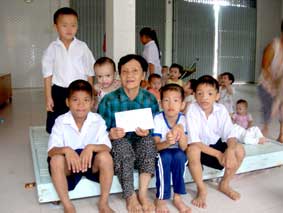 Cô Tư (Phật tử chùa Bửu Trì, một trong những người quản lý, chăm sóc trẻ em) và các cháu bé mồ côi, khuyết tật nhận tiền do bạn đọc Báo Cần Thơ gởi tặng. Ảnh: H.V