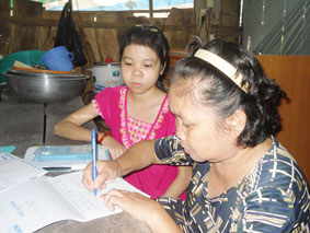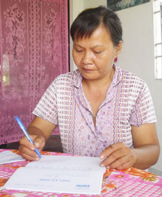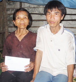 Mẹ con Bích Em ký tên nhận tiền do bạn đọc gởi tặng.