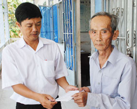Cán bộ văn phòng UBND xã Trường Long, huyện Phong Điền trao tiền của bạn đọc Báo Cần Thơ gởi ủng hộ ông Huỳnh Ngọc Điệp ở ấp Trường Phú B.