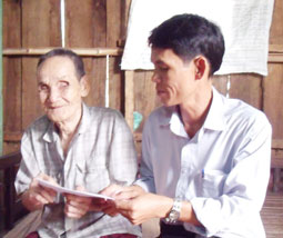 Ông Lê Bá Toàn (ngồi bên phải), Trưởng ấp Mỹ Nhơn, xã Mỹ Khánh, huyện Phong Điền trao tiền của bạn đọc gởi giúp cho ông Võ Văn Răng.
