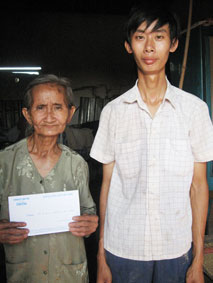 Bà Tư Lanh và người cháu nhận tiền của nhà hảo tâm gởi tặng. Ảnh: ĐOÀN LÝ. |
